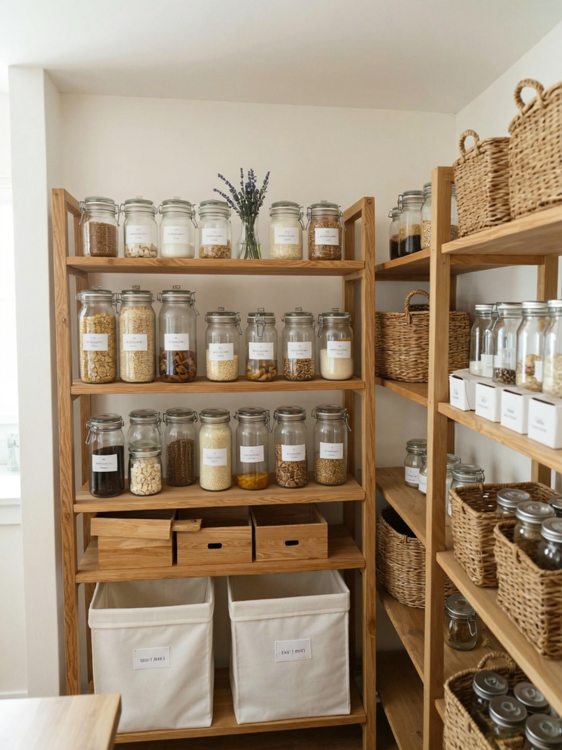 Group by category — snacks, breakfast items, grains — and decant into clear containers.