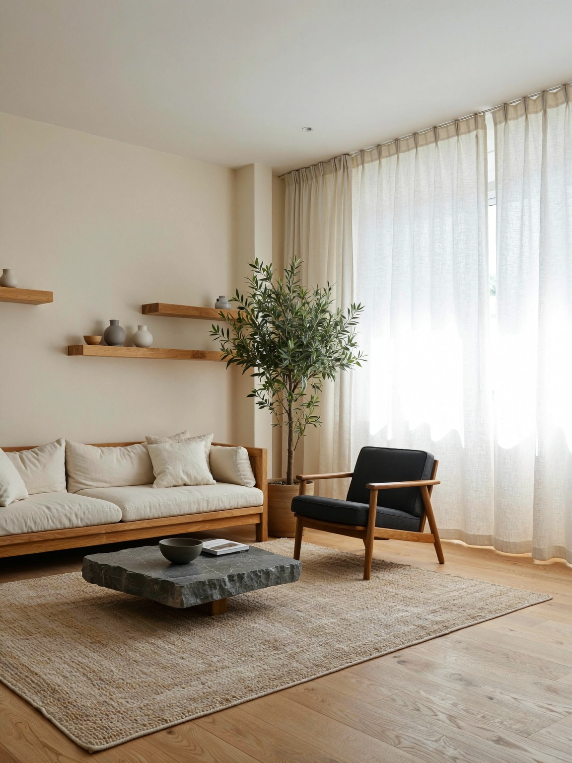- Choose a Color Base — Pick 3–4 tones: warm beige, oak wood, linen white, soft gray.