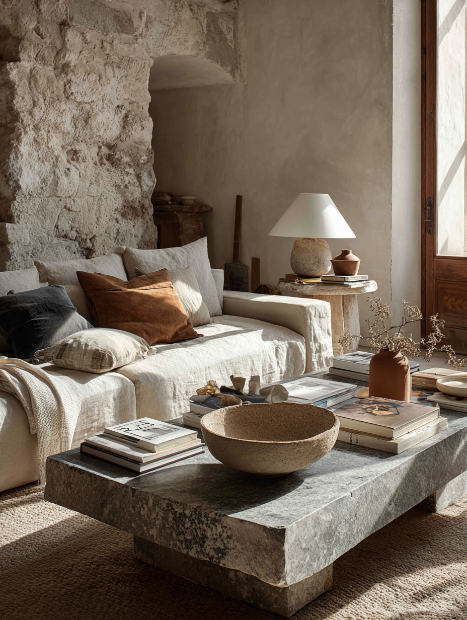 - calming materials like limewash, plaster, stone, and raw wood